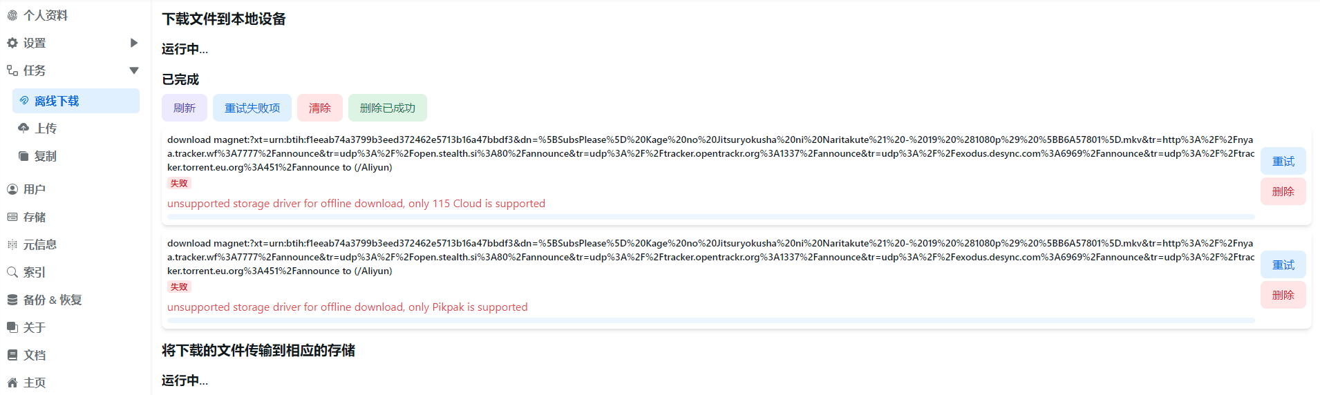 - unsupported storage driver for offline download, only 115 Cloud is supported